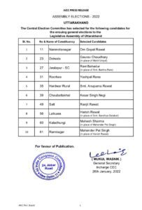 उत्तर प्रदेश कांग्रेस ने जारी की प्रत्याशियों की सूची जारी : देखे January 26, 2022 पहाड़ की चिंगारी 🔊 Listen to this देहरादून : Continue Reading Previous बिग ब्रेकिंग : कोरोना काल में गणतन्त्र दिवस समारोह-2022 के आयोजन के सम्बन्ध में दिशा-निर्देशNext बिग ब्रेकिंग : सीएम धामी दिल्ली मे आज पीएम मोदी को करेंगे आमंत्रित, इन केंद्रीय मंत्रियो से मिल गई सहमति
