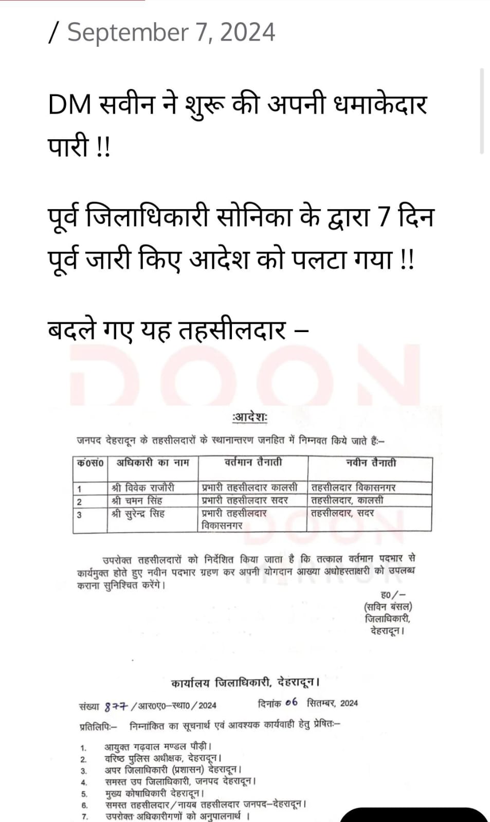 बिग ब्रेकिंग : जिलाधिकारी सवीन बंसल ने की धमाकेदार शुरुवात देखे आदेश