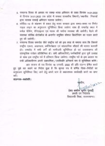 अतः शासन के पत्र दिनांक 19 जनवरी, 2022 की प्रति संलग्न प्रेषित करते हुए मुझे यह कहने का निदेश हुआ है कि कृपया पत्र में वर्णित दिशा-निर्देशों का अनुपालन सुनिश्चित किए जाने हेतु अपने स्तर से यथावश्यक कार्यवाही करने का कष्ट करे